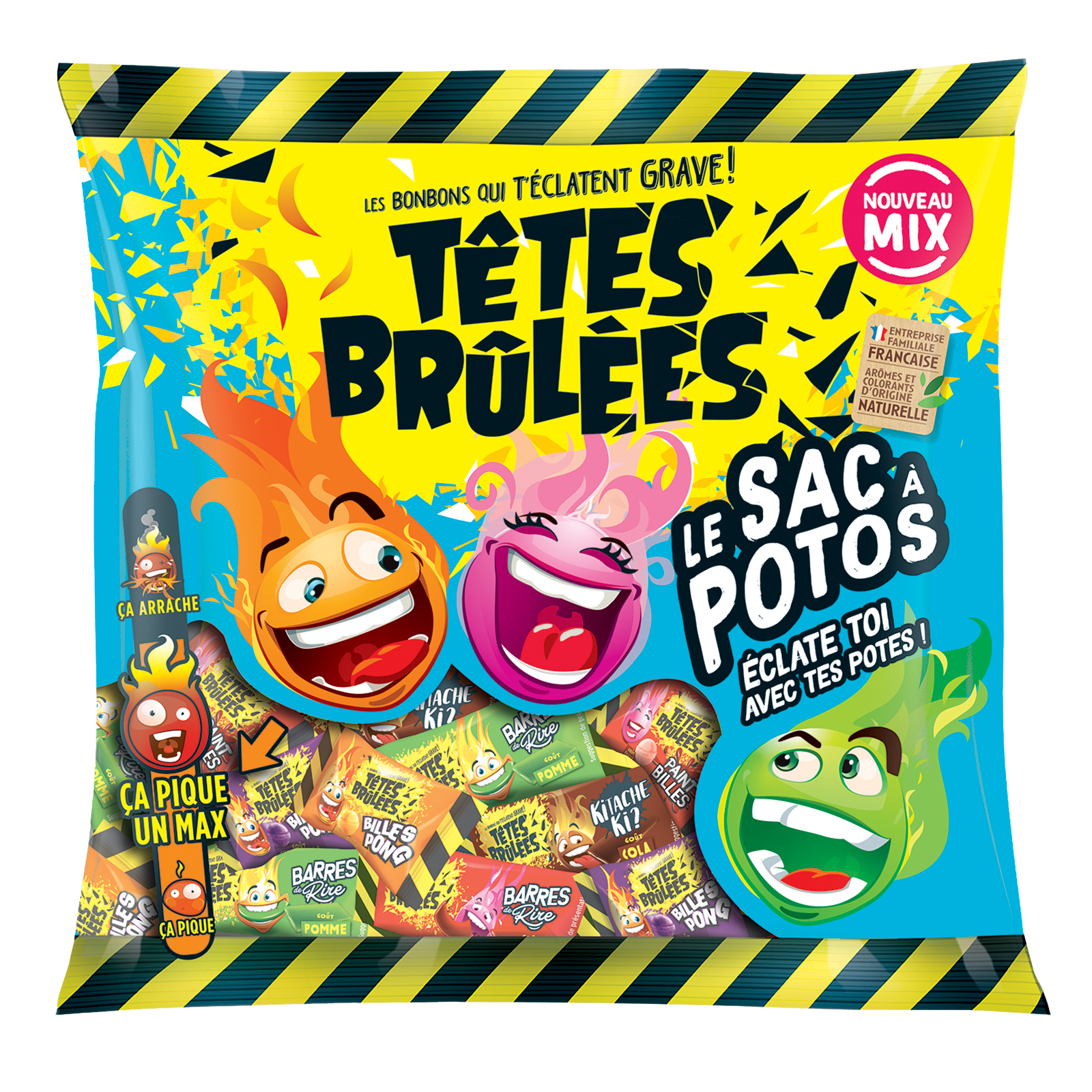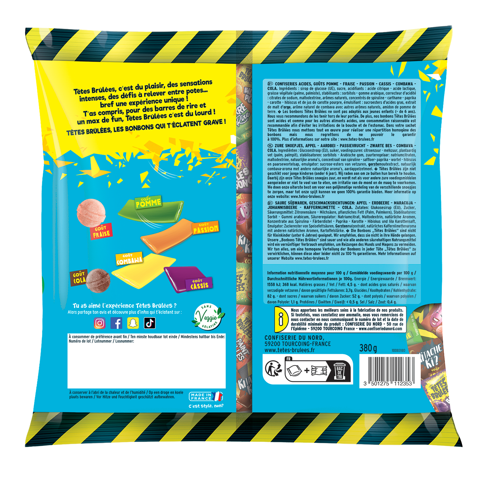 A l'intérieur de ce sachet (380g), vous pouvez déguster nos billes acides aux goûts de fraise et de cola. Ainsi que nos barres gourmandes à la pomme et nos pâtes à mâcher acidulées aux goûts de cola et citron !